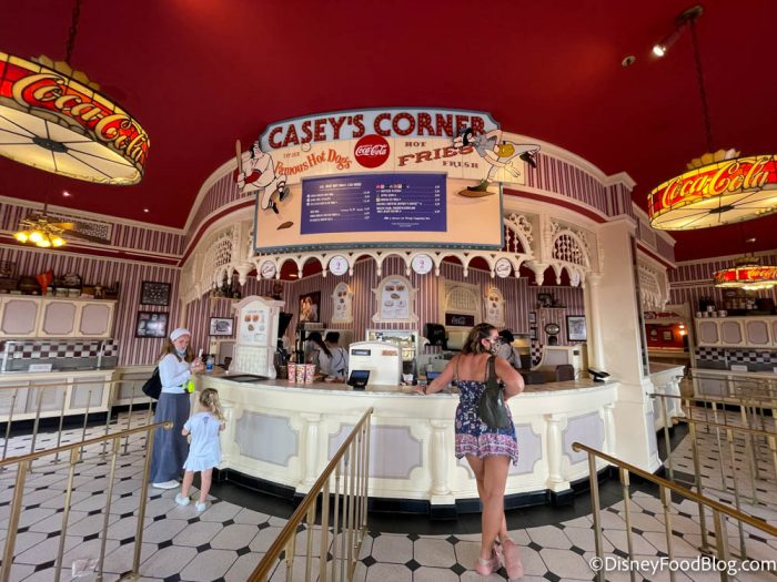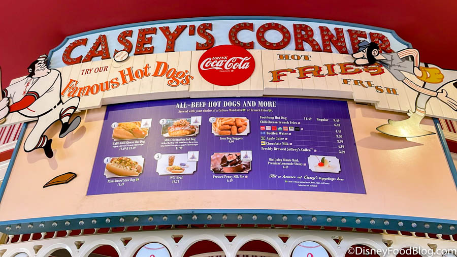 And being us, you know we’re going to try out all the most interesting treats, so we headed over to Casey’s Corner at Magic Kingdom, where three NEW special 50th anniversary menu items have debuted! THREE!!! Like where do we start? Decisions, decisions…