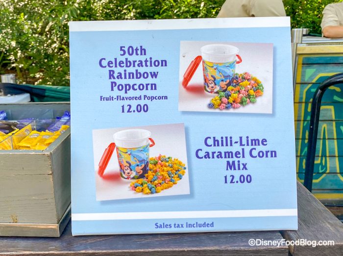 Thanks to this handy sign, you can see two NEW popcorn mixes arrived in Disney’s Animal Kingdom. There’s a 50th Celebration Rainbow Popcorn (fruit-flavored) and a Chili-Lime Caramel Corn Mix — both $12 with the popcorn bucket. We spotted these at the popcorn cart right by Animal Kingdom’s new show, KiteTails!