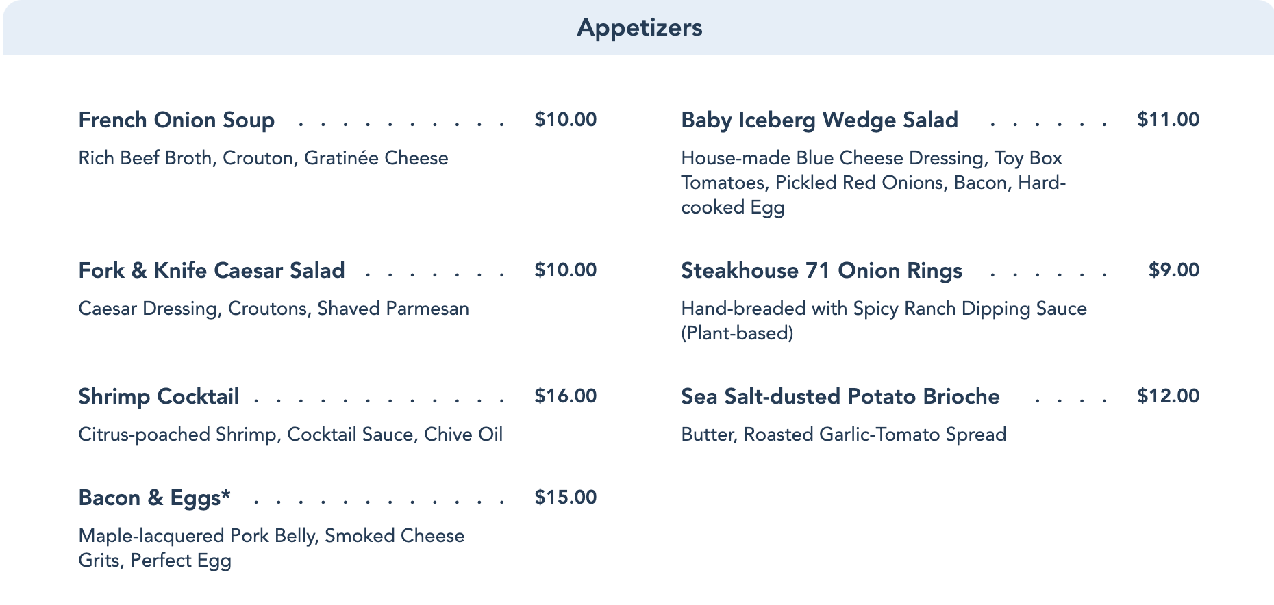 If you were wondering whether or not The Wave’s signature Bacon & Eggs made the cut, we’re pleased to share that they are indeed a part of Steakhouse 71’s Appetizer menu!