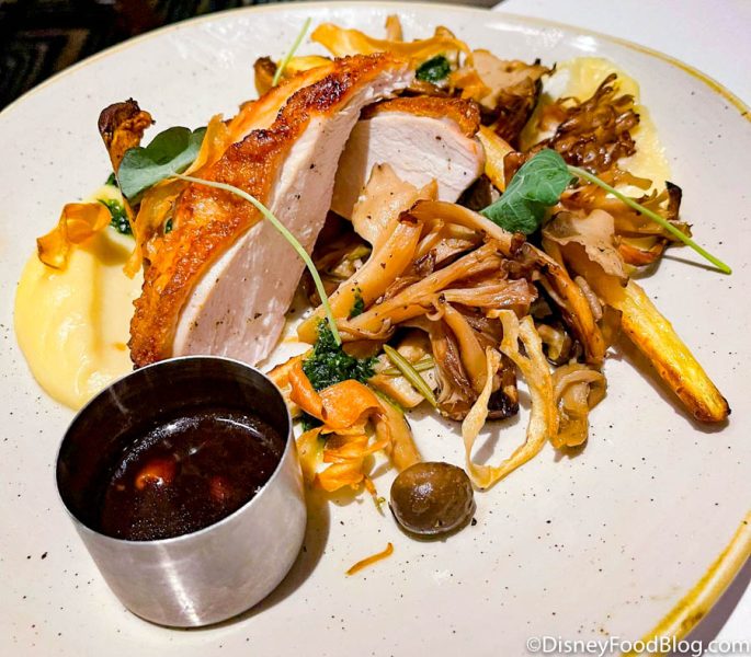Next up, the Chicken Chasseur was the least expensive of the three entrées on the dinner menu at $24. Like the fish, this chicken was prepared like it would have been in the 70s. This meal consisted of a Pan-Seared Airline Chicken Breast, Parsnip Purée, and Roasted Mushrooms. It also had a Sauce Chasseur.