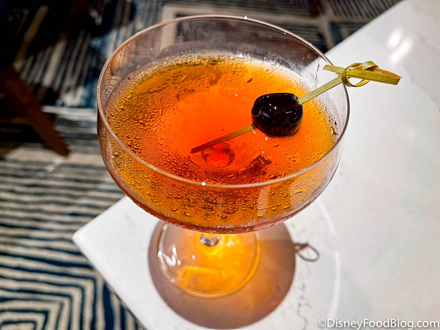 Finally, there was the $17 Cocoa Boulevardier cocktail. It’s made with Knob Creek Disney Single Barrel Reserve Bourbon, Campari, Carpano Antica Formula Vermouth, and Chocolate Bitters. Oh boy, this one was STRONG. We immediately tasted an aggressive bourbon flavor with a whisper of chocolate at the end. You better like bourbon if you order this — we loved it though!