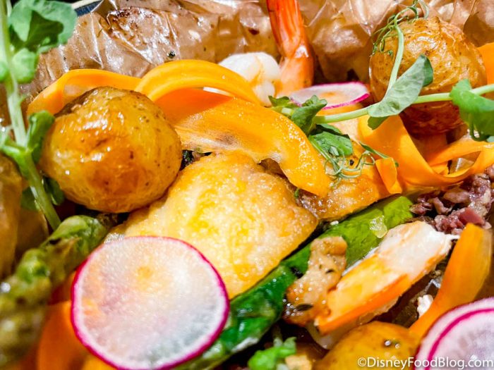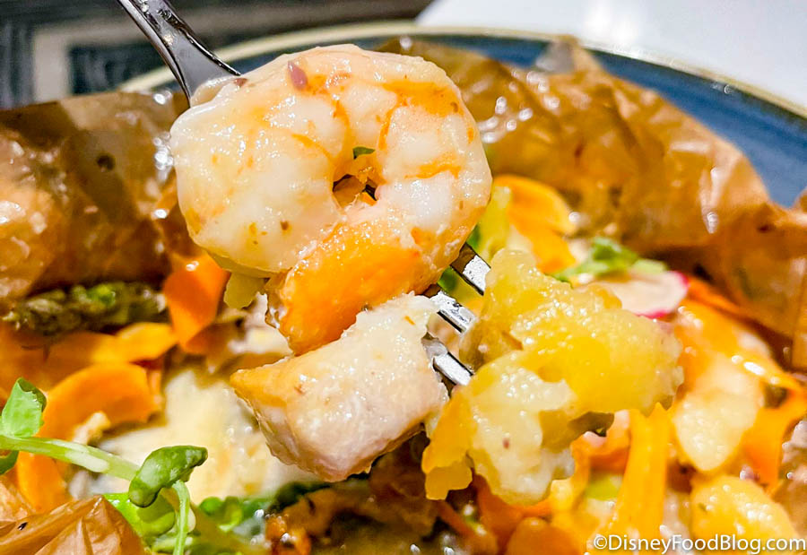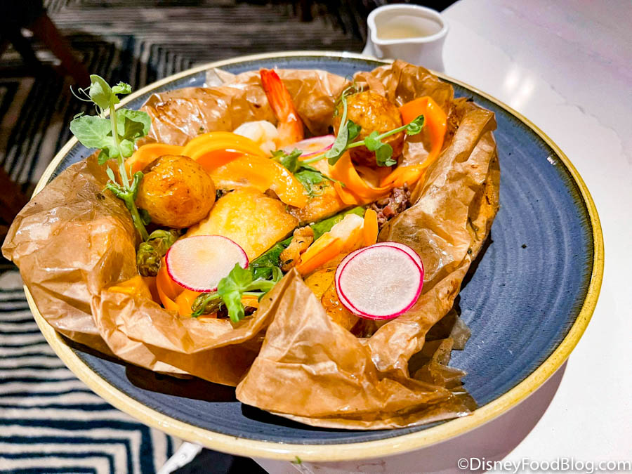 The fish was a little chewier than some other fish we’ve had in Disney World, but still had a great flavor. We thought the lemon sauce (normally poured tableside) was the real star here; it was the perfect addition to the fish. The potatoes and vegetables were perfectly cooked in their little parchment paper pouch, too!