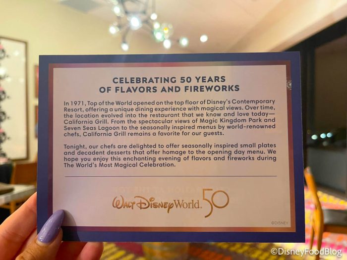 Celebration at the Top is located at California Grill, which can be found on the fifteenth floor at Disney’s Contemporary Resort. We rode the elevator up to check out this new dessert party as the 50th Anniversary Celebration officially kicks off!