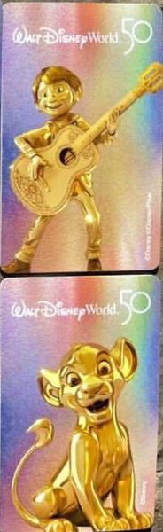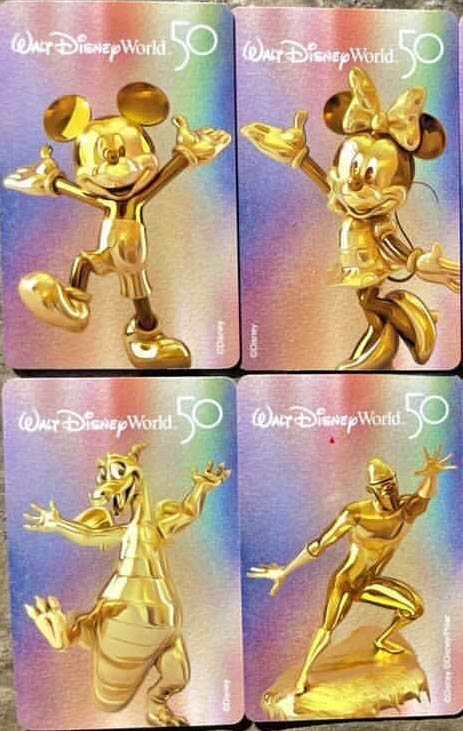 Thanks to @themeparkologist on Instagram, we have a first look at the new Disney World ticket designs for the 50th anniversary! These tickets feature an EARidescent background with the gold character statues we’ve seen in the parks.