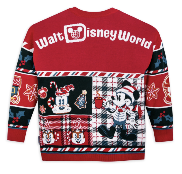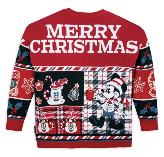 This Mickey Mouse and Friends Merry Christmas Sweater has a holly leaf with a hidden Mickey on the front, along with appearances by Mickey, Goofy, Donald, Daisy, and Chip ’n Dale.