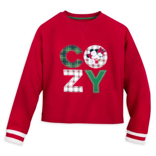 In terms of sweaters in adult sizes, Disney has a Minnie and Mickey Holiday Pullover Sweatshirt for women with the phrase “Cozy” on the front!