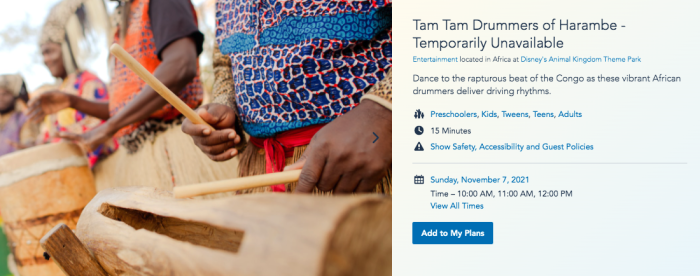 Update: The Disney World website now shows hours for the Tam Tam Drummers of Harambe starting November 7th.