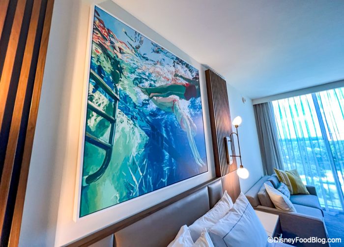 The art in this room shows people underwater in a pool and is framed on either side by wooden detailing.