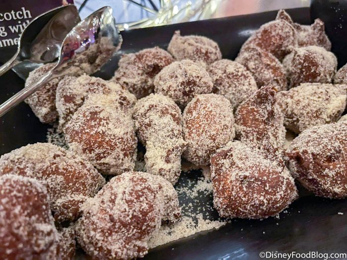 The Devil’s chocolate pudding (made of chocolate filling, crumble brownie, milk chocolate, and whipped cream) really packed a good, real chocolate flavor, rather than just an artificial or surface-level chocolate flavor. The crunchy pearls added a nice change in texture, and the brownie pieces on the bottom added even more chocolate flavor to the treat. If you love chocolate, this might be a good choice for you. It’s a basic treat and a little bit on the boring side (great for little ones) but still very tasty. It’s worth noting some of these foods are labeled to indicate you could currently find them at various locations around the park when, in fact, you can’t. For instance, the Devil’s Chocolate Pudding can be found at the Friar’s Nook (but only…it can’t!).