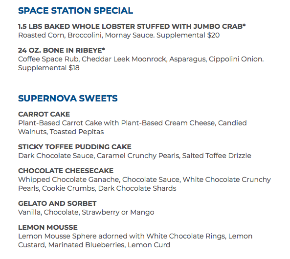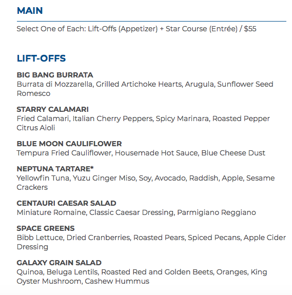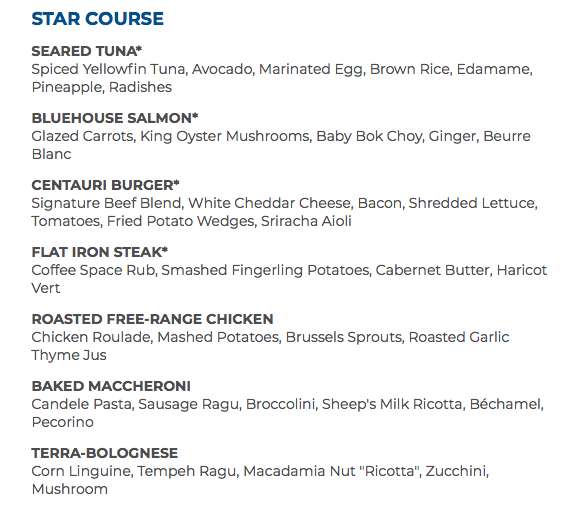 For the “Star Course,” guests can choose entrees like Seared Tuna, the Centauri Burger, and more.
