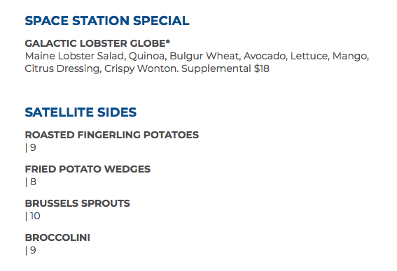 There are also Space Station Specials, like the Galactic Lobster Globe. These, along with various sides are available for an additional charge.