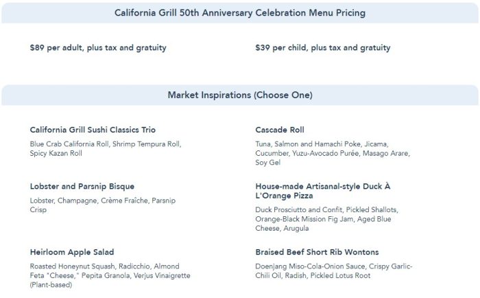 As we mentioned, you do have access to a paper menu at your table. Note the options that have a “50” next to them. These choices are specifically inspired by Walt Disney World’s 50th Anniversary! A good number of guest-loved classics are still available as well. The new menu offers a prix fixe meal priced at $89 per adult and $39 per child, plus taxes and gratuity. At the start of the meal, you can select a Market Inspiration (AKA appetizer) such as the California Grill Sushi Classics Trio or the Heirloom Apple Salad.