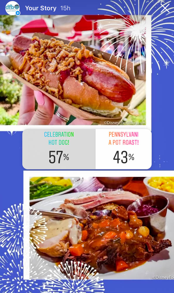 We’re sticking with savory foods for the moment, with the 50th Celebration Hot Dog from Casey’s Corner going up against the Pennsylvania Pot Roast from Liberty Tree Tavern. In the end, the funnel cake-topped hot dog beat out the classic pot roast, with 57% of the votes. We have to agree with these results too — that hot dog was not nearly as gross as we thought it would be. 😂