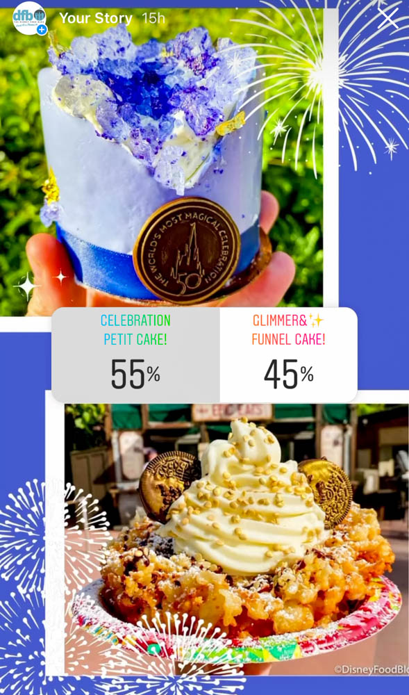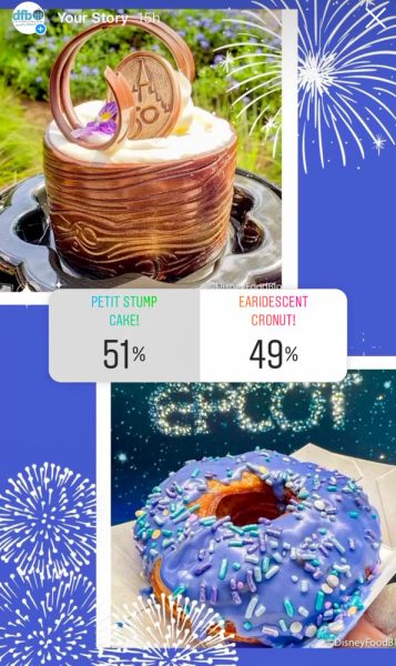 Two of the PRETTIEST 50th Anniversary treats went head-to-head with this next match-up. It’s the 50th Anniversary Petit Cake from Amorette’s Patisserie in Disney Springs against the Glimmer and Shimmer Funnel Cake from Epic Eats in Hollywood Studios. This one was tough, because they’re both just so beautiful! But the petit cake won out in the end, 55% to the funnel cake’s 45%.