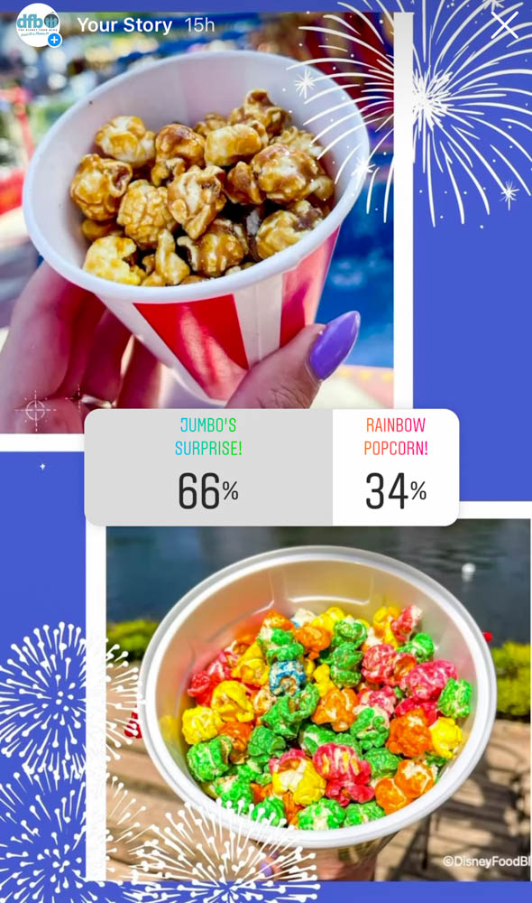 Our next match-up is between a Disney World classic — popcorn! Did you choose the caramel and Twix goodness of Jumbo’s Surprise in Magic Kingdom or the fruity flavors of Rainbow Popcorn from Disney’s Animal Kingdom? Chocolate won out again here, with Jumbo’s Surprise taking the lead, 66% to 34%.