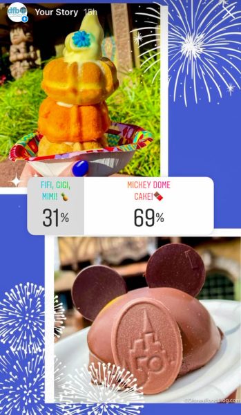 For the first match-up, we put the tropical Fifi, Gigi, Mimi from Aloha Isle Refreshments against the chocolate-y Mickey Mouse Dome Cake from Gaston’s Tavern. These are two VERY different Magic Kingdom treats, so which flavor will win out: tropical or chocolate? The answer is chocolate — by a LOT. The dome cake got 69% of the votes, compared to Fifi, Gigi, Mimi’s 31%.