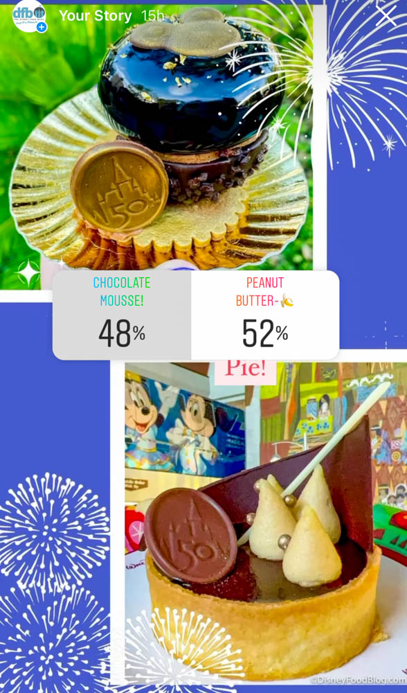 It’s the parks against the hotels now, with the Chocolate Mousse from the ABC Commissary in Hollywood Studios up against the Peanut Butter Banana Pie from Contempo Cafe at Disney’s Contemporary Resort. The peanut butter pie is one of our favorite treats, so we were happy to see it won — but just barely! The pie took 52% of the votes compared to the mousse’s 48%.