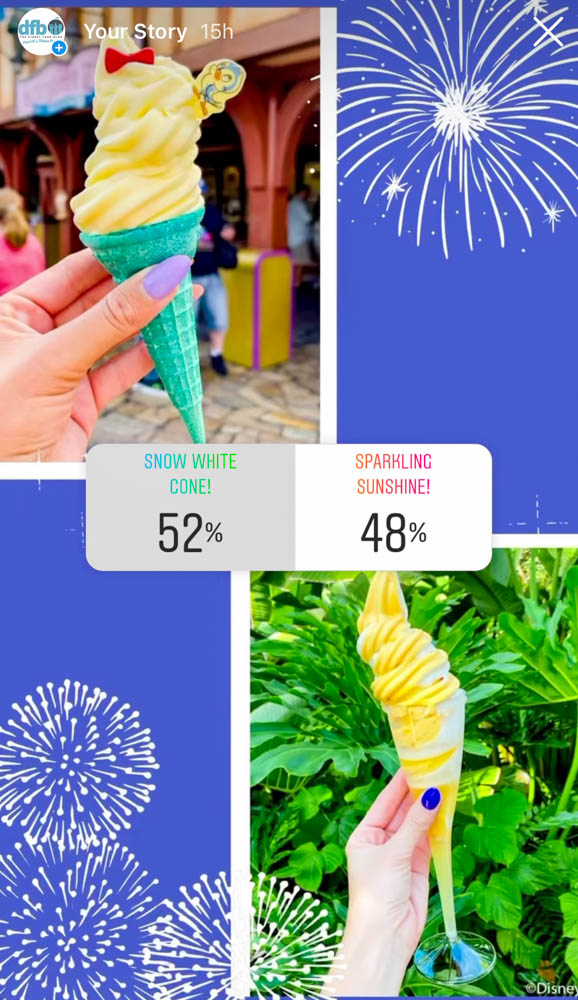 OK, the next pairing is a little controversial, because we pitted two DOLE Whips against each other! It’s the Snow White Cone from Storybook Treats against Sparkling Sunshine from Sunshine Tree Terrace. Although DOLE Whip in a champagne glass looks very fancy, the beautifully themed Snow White Cone just barely took the lead, with 52% of the votes. And how could it not with such a cute little red bow on top?