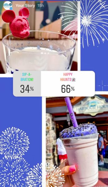 Next up is a DRINKS match-up, with the Sip-a-Bration drinks from Steakhouse 71 going against the Happy Haunts Milkshake from Columbia Harbour House. The sweet milkshake won out over the tart lemonade here, with Happy Haunts taking 66% of the votes! Does it help that the milkshake is topped with a delicious chocolate doughnut? Absolutely it does.