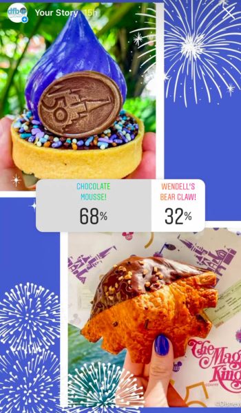 We were ready for something SWEET next, so this match-up is between Chocolate Mousse from The Mara (at Disney’s Animal Kingdom Lodge) and the Wendell’s Bear Claw from Westward Ho Refreshments. This one was no contest at all, with the Chocolate Mousse taking the lead with 68% of the votes. It’s clearly the better-themed of the two!