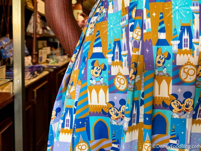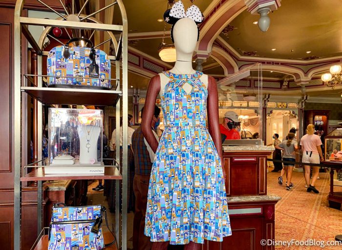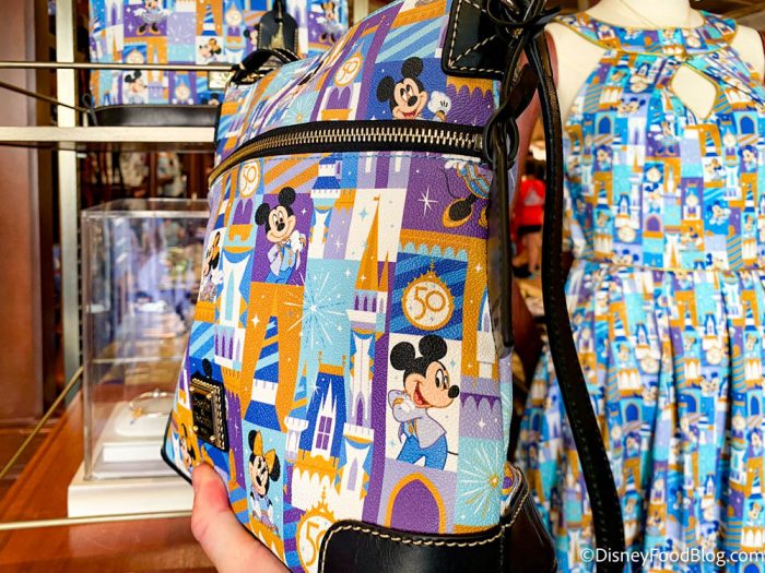 This collection has three different purses, a gorgeous dress, and a new MagicBand, all with the same pattern inspired by Mickey and Minnie Mouse celebrating the 50th Anniversary. The iconic characters are surrounded by Mary Blair-style art of Disney World that’s giving us big “it’s a small world” vibes. Let’s check out the new items!