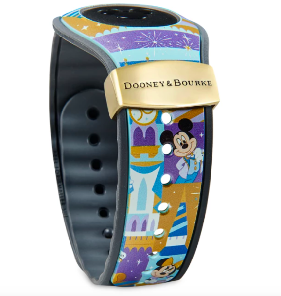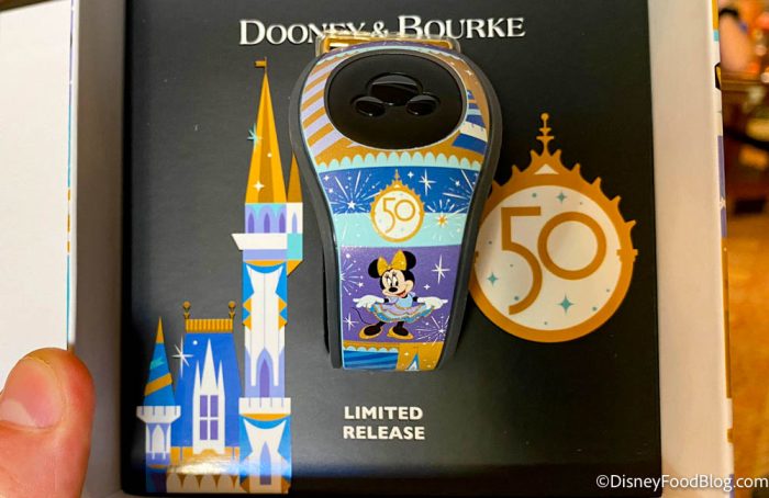 The Dooney and Bourke 50th Anniversary MagicBand has the 50th design all around the band, with a gold “50th” logo clip on the side.