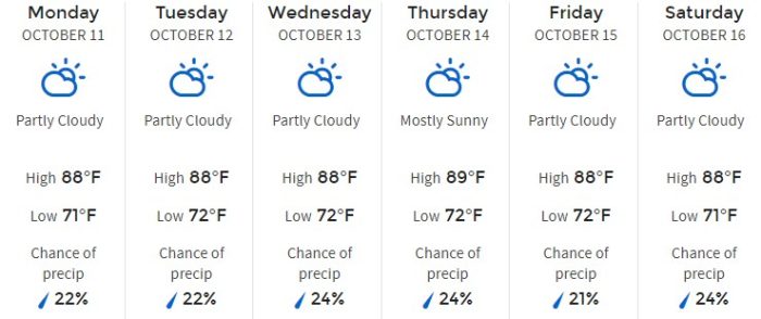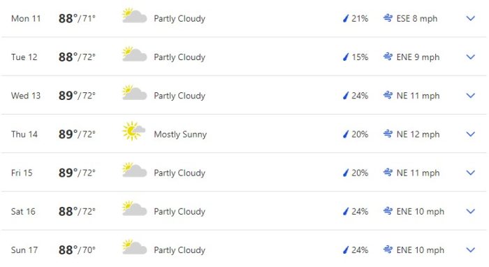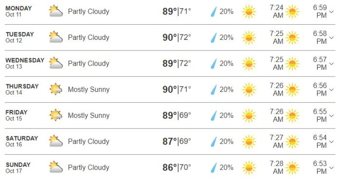 Here is a full overview of the week according to The Weather Channel. Temperatures are projected to hang out in about the same place for the whole week again. We’re looking at a range of 88 to 89-degree highs and 70 to 72-degree lows.