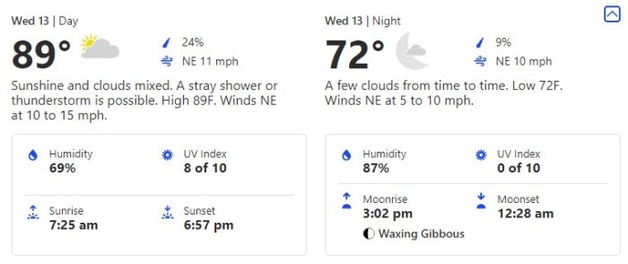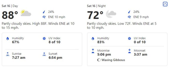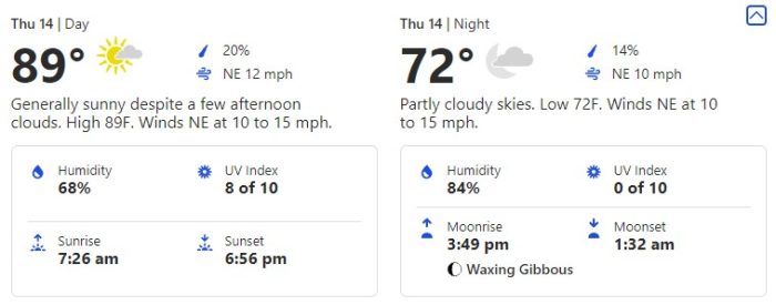 For Thursday, October 14th, we’re seeing a day with another consistent prediction of temperatures in the high-80s and an evening at 72 degrees.