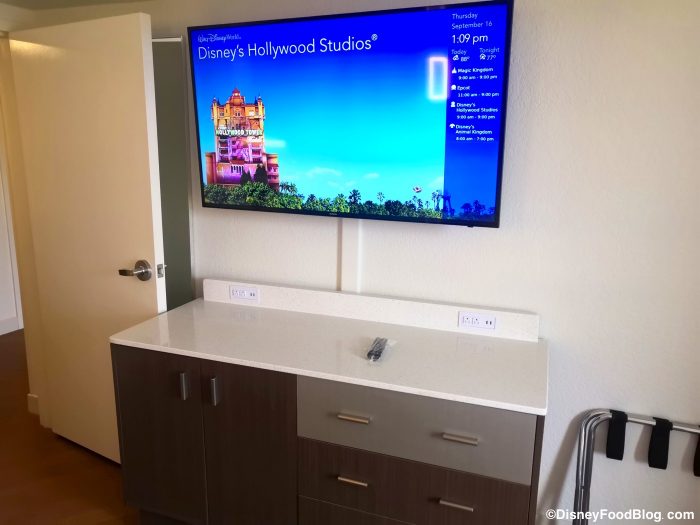 In the bedroom, you’ll find a TV and dresser (the same setup as the living room) with plenty of plugs, and there’s a full-length mirror behind the door.