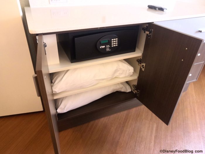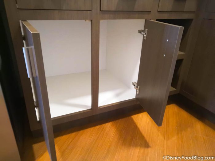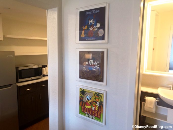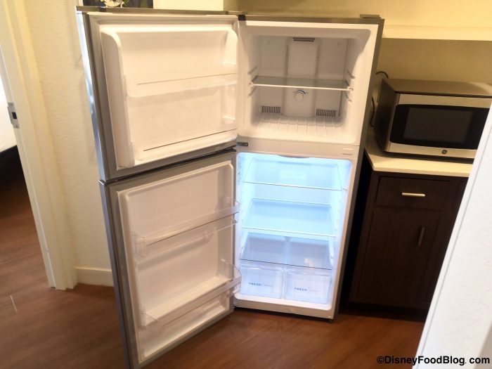 In the kitchen, you’ll find plenty of room in the fridge, so you can store all your leftovers or brought-from-home snacks here. In fact, this is one of the larger fridges available in a Disney World hotel room. The ones in the family suites at Disney’s Art of Animation Resort are mini-fridges.