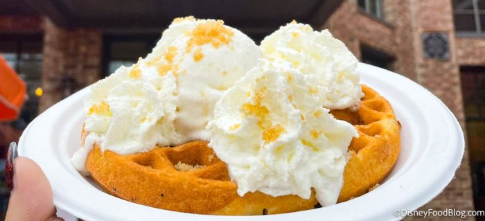 If you’re looking for something more seasonal, though, we tried a couple of fall treats as well. Vivoli is no stranger to pumpkiny ice cream, waffles, and more. Last year, we had the pumpkin waffle sliders here. This year, we went with a classic — the Pumpkin Waffle.