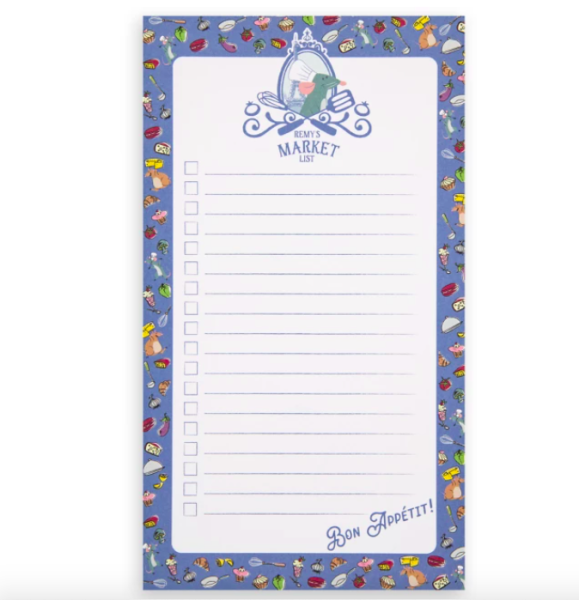 The notepad has lines with boxes so you can check off your list, and the border has designs of food, Remy, and Emile. There’s a magnet on the back so you can stick it on your fridge as well. It’s $12.99 on shopDisney.