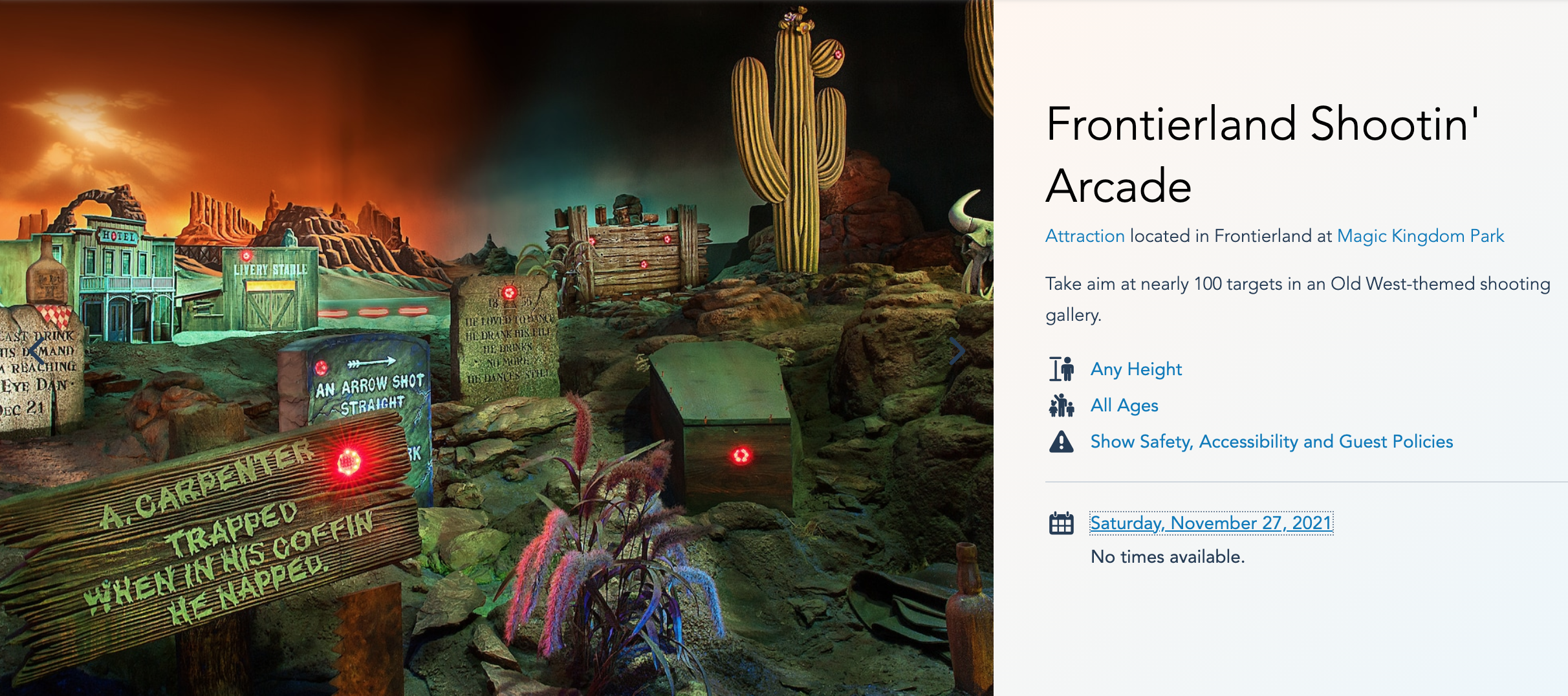 According to the Disney World website, there are no operating hours listed for the Frontierland Shootin’ Arcade starting on November 27th, 2021.