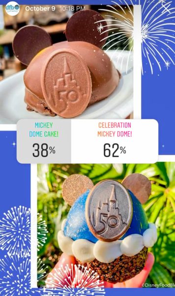 To start out, we had the battle of the dome cakes! The chocolate-y Mickey Mouse Dome Cake from Gaston’s Tavern went up against the 50th Celebration Mickey Mouse Dome from Creature Comforts. In this case, the bright colors and more exciting theming won out, with the Celebration Dome beating out Gaston’s creation by 24%. Does it hurt that the Celebration Dome has a whole brownie as its base? Probably not.