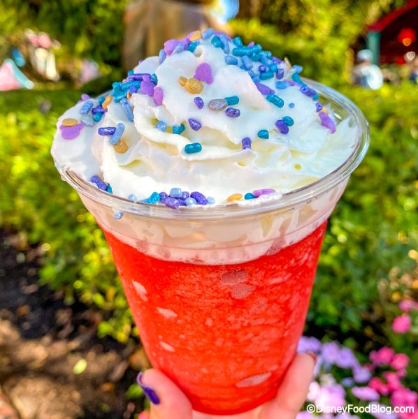 This drink reminded us of a strawberry Slurpee you can get from 7-Eleven! That’s not necessarily bad, but we don’t think that’s what Disney was going for here. There was a tiny hint of the tea flavor, but not a lot, and we honestly wish there would’ve been more. If you hadn’t told us we’d think it was just another strawberry slush.