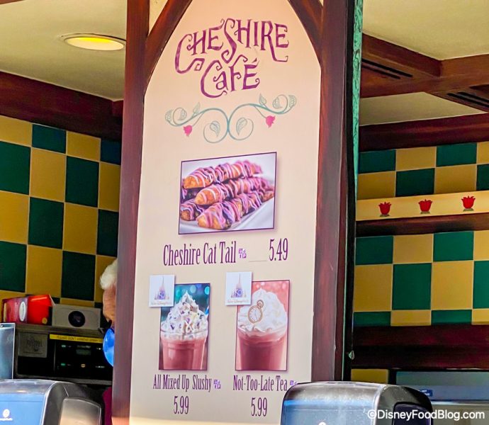 Over at Cheshire Cafe in Fantasyland, there are two new slushies for the 5oth! Here’s the thing though — we get it. Alice in Wonderland…Mad Tea Party…tea…we get it. But a tea-centric drink in Disney World? Unless it’s a sweet tea slush (and even then!), it’s not necessarily universally appealing. Many kids likely scrunch up their face at the idea of tea.