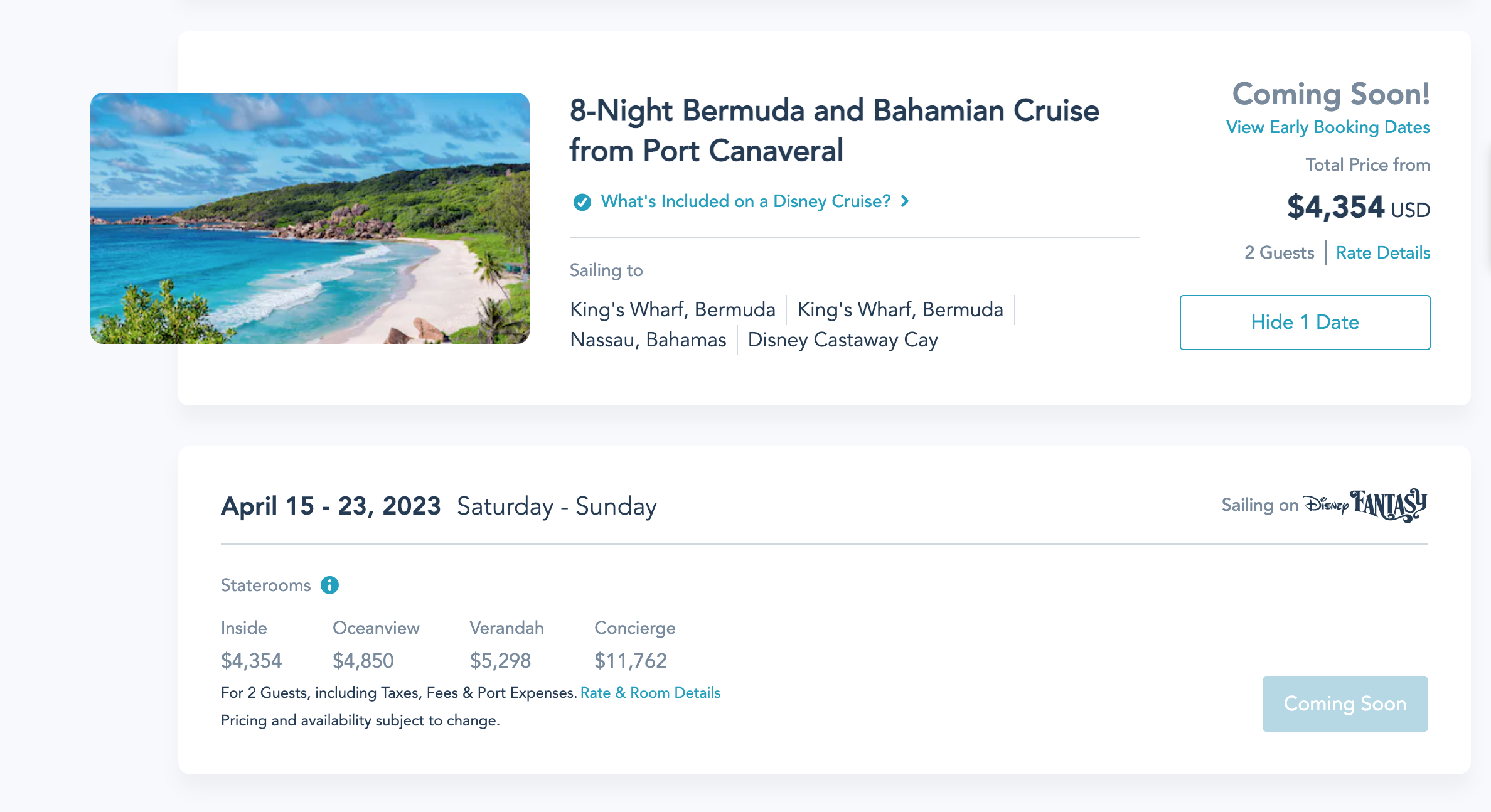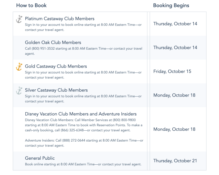 Select guests will be able to book 2023 departures early, including Platinum, Gold, and Silver Castaway Cay Club members, Golden Oak residents, Disney Vacation Club Members, and Disney Insiders. Booking opens to the general public on October 21st, 2021.