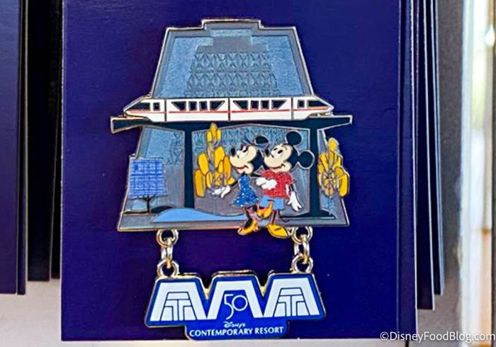 Mickey and Minnie Mouse are on the pin as well, looking up at the Monorail in their ’70s-inspired outfits. Hanging from the bottom is a little outline of the resort and a “50th” logo.