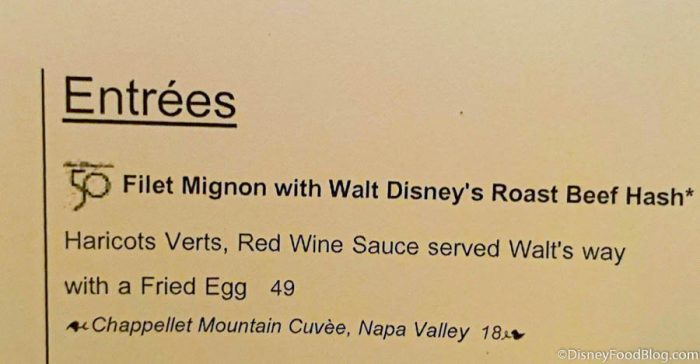 The 50th eats on the menu include one entree and one dessert, so we’re starting out with the Filet Mignon with Walt Disney’s Roast Beef Hash for $49.