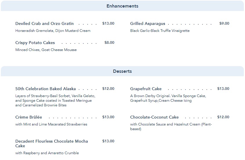 You can take a look at the Enhancements if you’re hoping to add a little extra to your main course (basically pricier extra sides). Then, you can wrap up your meal with a Dessert like the famous Grapefruit Cake!