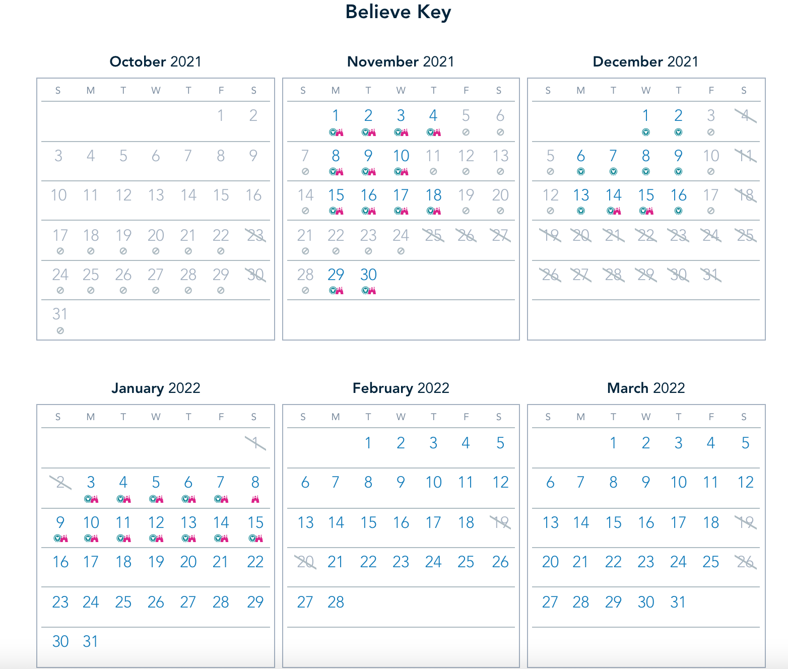 The Believe Key pass comes with a few blockout dates built into it, as noted with a slash on the calendar. But, aside from the dates that are blocked out for the pass, many dates have now filled up. In terms of what’s open, it looks like there is still availability in both parks some weekdays in November and December, but they’re filling up.