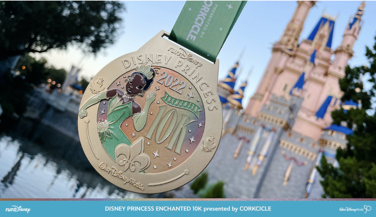 The Disney Enchanted 10K runners will receive a medal starring a running Tiana with a sparkly EARidescent background.