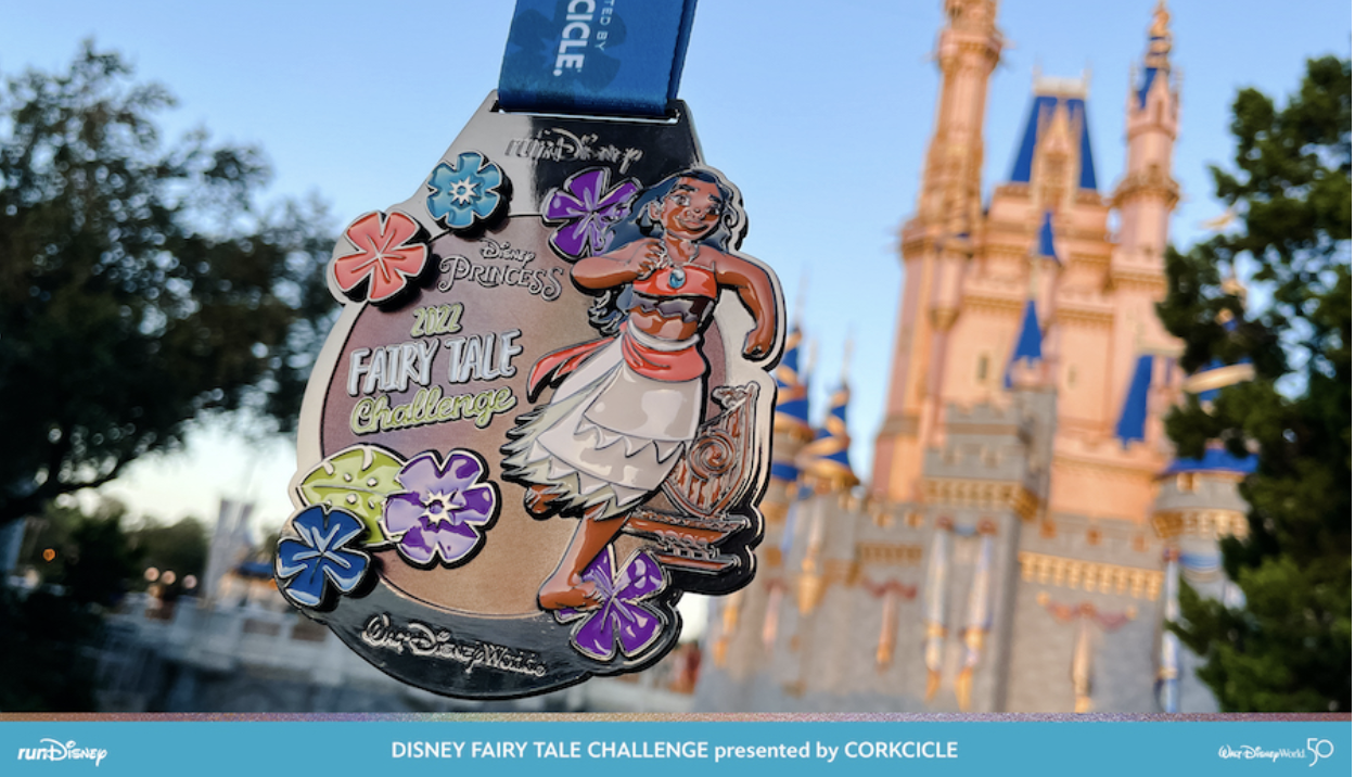 And if you complete the Fairy Tale Challenge by running in both the Disney Princess Enchanted 10K and the Half Marathon, you’ll get a medal with Moana happily running along with you!