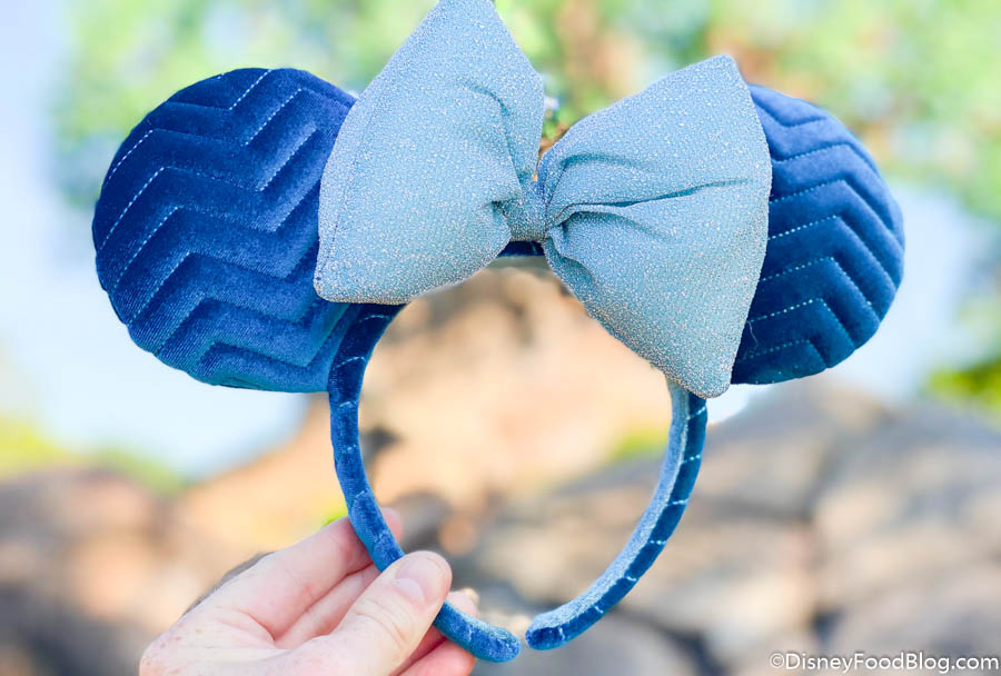 The Blue Velvet Ears feature a blue chevron design with a sparkly blue bow. The ears are made with a velvety material.