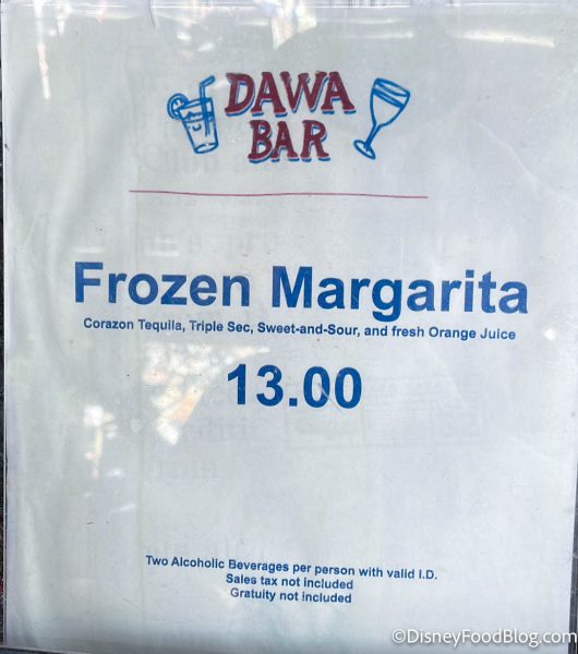 At Dawa Bar, we found a sign for Frozen Margaritas for $13. They’re made with Corazon Tequila, Triple Sec, Sweet-and-Sour, and fresh Orange Juice.