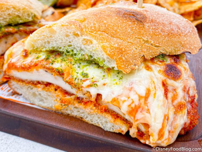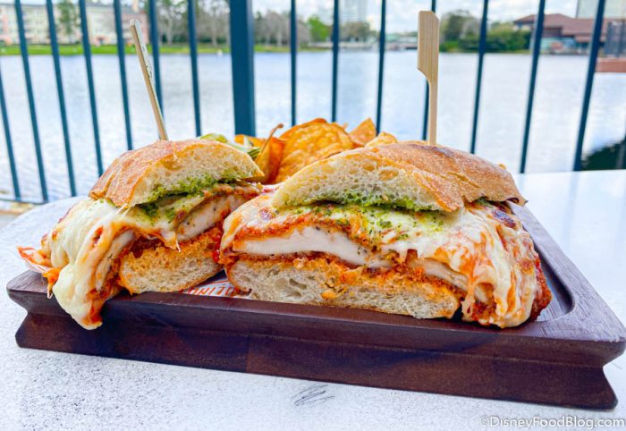 This sammie is Chicken Parmesan with Mozzarella and a Basil Pesto Sauce served with House-made Pecorino-truffle Potato Chips and Pickles. Wow, color us intrigued!