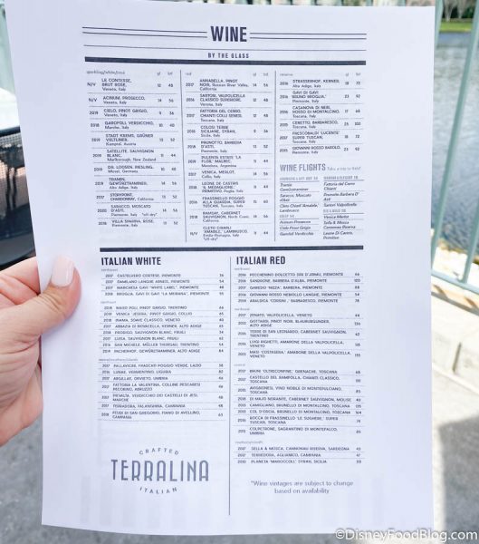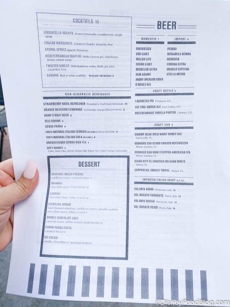We were very happy with our experience. Some of the menu items can get a bit pricey, especially if you’re used to Italian fare from home. Compared to most prices for sit down meals in Disney World, it’s really not too bad though. However, if you’re looking to share you can definitely get your money’s worth. We recommend checking the menu before visiting and deciding what you want and what’s a good value to your crew. If you want to enjoy a glass of wine (or two!) and a casual meal, this is a great spot to do it, especially if a lot of other spots around Springs are already booked up. Plus, they offer a nice happy hour from 4-6PM at their outdoor bar.