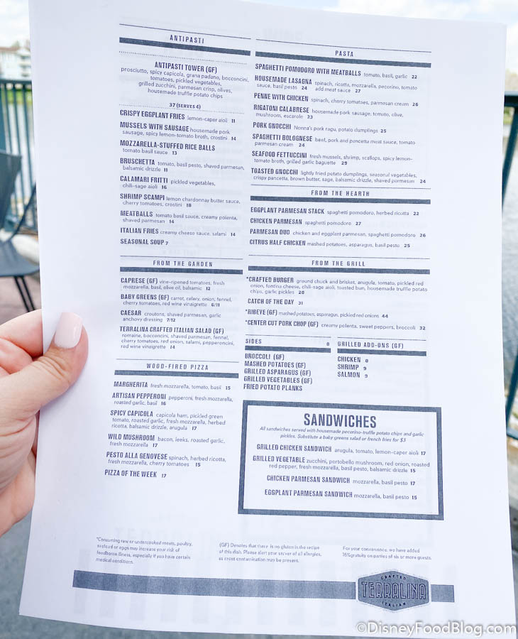 - Dining in Disney Springs isn’t in your plans. Terralina is great, but we’re not sure it’s worth a trip to Disney Springs when you don’t have time for it! If you’re still craving Italian food in the parks, try Via Napoli in EPCOT.