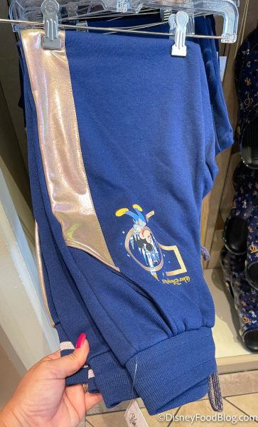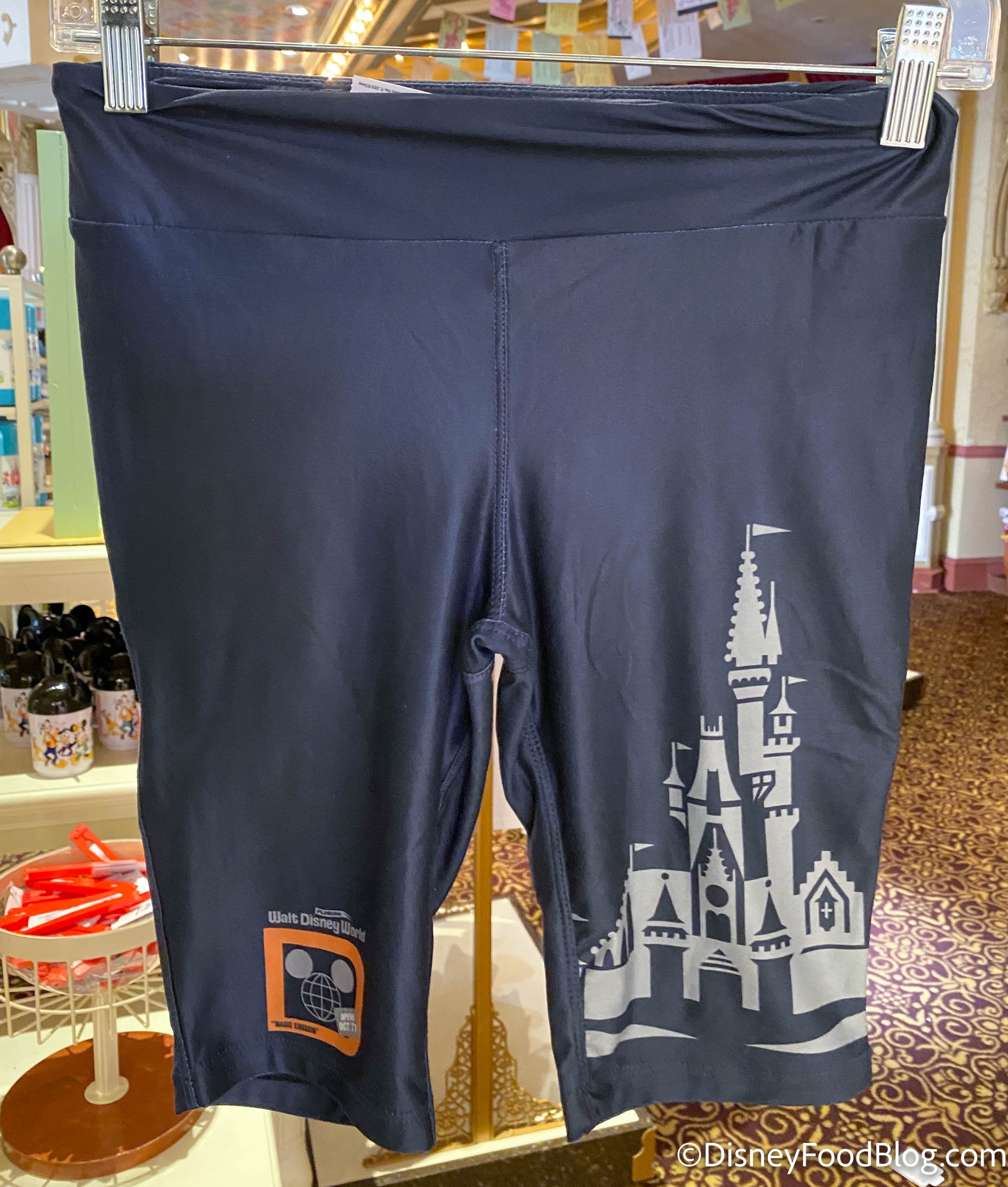The bike shorts have the Disney World logo on one leg and Cinderella Castle on the other leg.