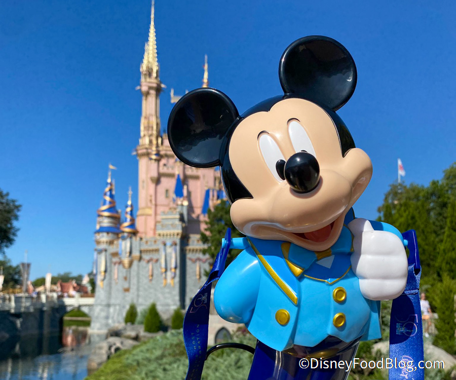 We found a new 50th anniversary Mickey Popcorn Bucket! He’s $18 and you can get $2 popcorn refills too. Mickey’s outfit is blue and gold with lots of EARidescent details.